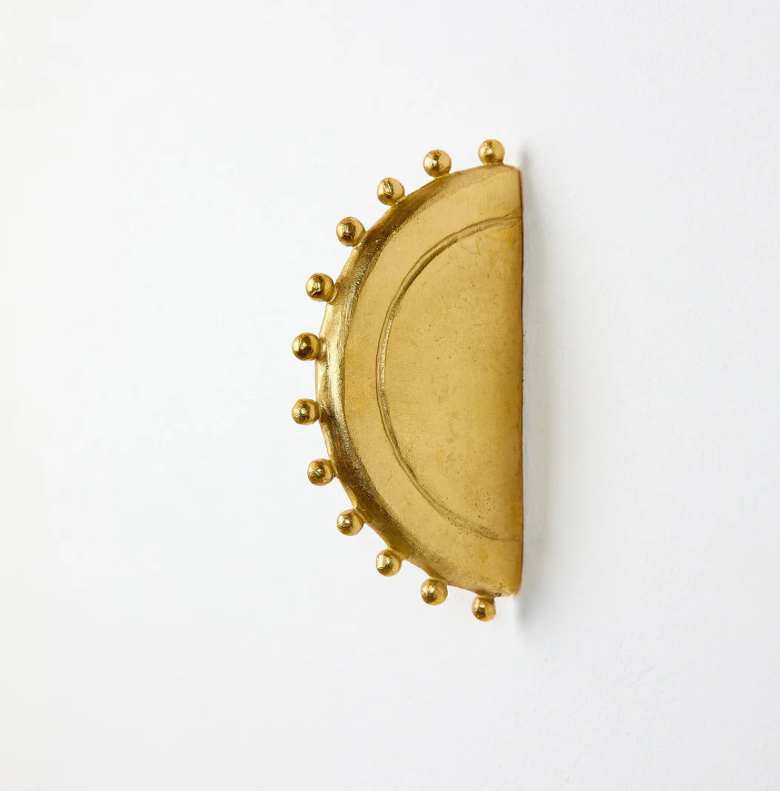 Crochet mural circulaire façonné en laiton massif, inspiré par la forme de la lune. Un détail à la fois fonctionnel et décoratif pour les entrées, les chambres ou les salles de bain. Durable, élégant et fabriqué artisanalement au Ghana, il est ensuite fini à Barcelone par Golden Editions.